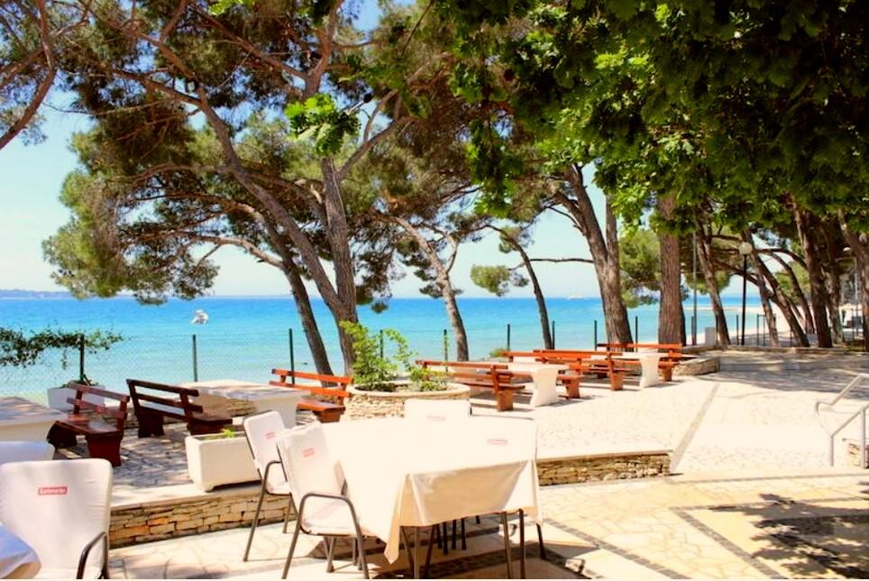 Z kempu je přímý vstup na velkou oblázkovou pláž Bi Val s pozvolným vstupem do moře a označenou zónou na plavání. Pláž byla oceněná modrou vlajkou za čistotu a kvalitu služeb. Pláže jsou převážně oblázkové, které doplňují skalnaté terasovité pobřeží a prostorné zatravněné plochy na opalování. Některé části pláže jsou písečné. Za poplatek si můžete pronajmout slunečníky a lehátka. Nechybí zde venkovní sprchy, převlékací kabiny, toalety, bary, stánky s občerstvením a možnost sportovního vyžití včetně pronájmu kajaků, loděk, vodních kol, jet ski nebo vodního lyžování. Najdete zde i školu plachtění, potápění a parasailingu. |