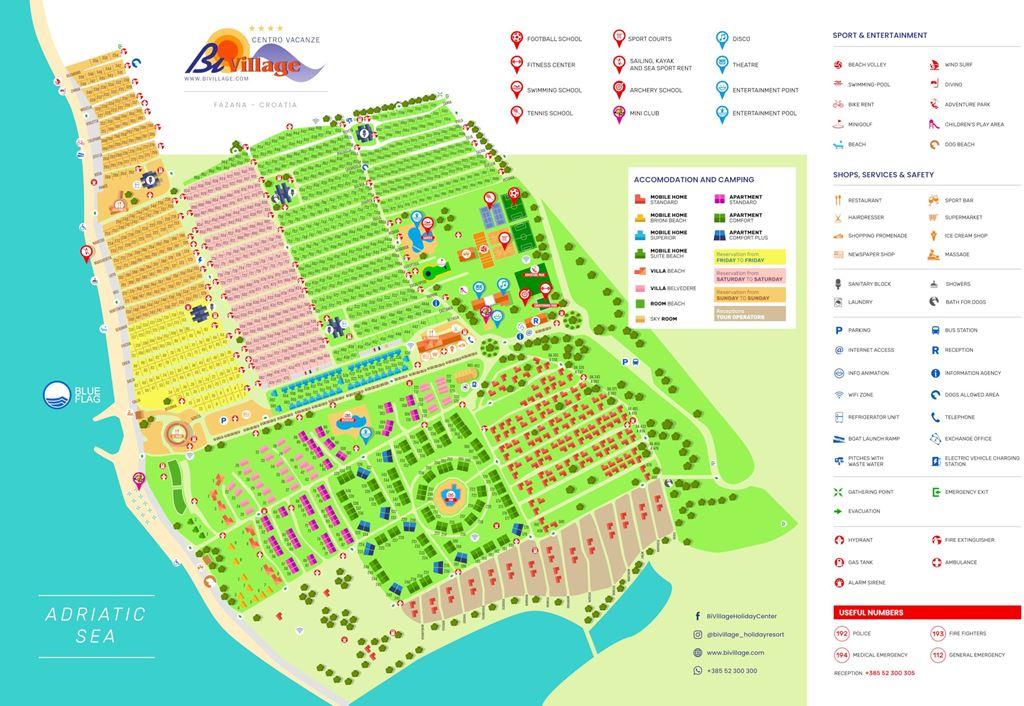 Camping Bi Village **** leží na poloostrově Istrie u města Fažany asi 7 km od Puly. Nabízí ubytování v komfortně zařízených apartmánech poblíž moře a bazénů, kvalitní zázemí pro rodinnou dovolenou, pláž s výhledem na Brijunské ostrovy, dětský akvapark, venkovní bazény, bohaté sportovní zázemí, animační program a pestrou nabídku restaurací a barů s občerstvením. Hned vedle kempu se nachází zážitkový lanový Park Jangalooz. Mapka areálu |